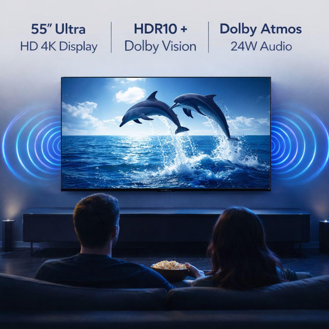 Transform your living room into a home theater with the 55-inch Android Smart TV. Experience breathtaking 4K visuals with HDR10 and Dolby Vision technology. The powerful Dolby Atmos audio system ensures rich, room-filling sound for movies, sports, and gaming.